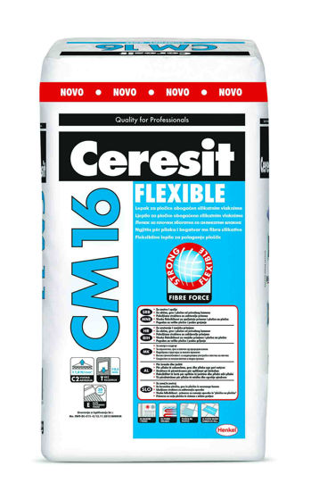 Ceresit CM 16 - FLEXFleksibilno ljepilo za keramičke pločice obogaćeno silikatnim vlaknima - FIBER FORCE tehnologija za keramičke i gres pločice za vanjsku i unutarnju primjenu visoka stabilnost i otpornost nasmrzavanje za primjenu pločica na pločicu za pločice velikog formata za površine s podnim grijanjem za oštećene i teške površine klasa ljepila: C2TE poboljšana struktura, velikaelastičnost na kritičnimOmjer miješanja: cca. 7,0 - 7,5 l vode na 25 kgVrijeme za primjenu: 2,5 - 3 sataMogućnost fugiranja: nakon 24 sata